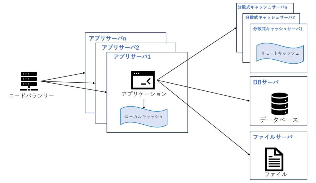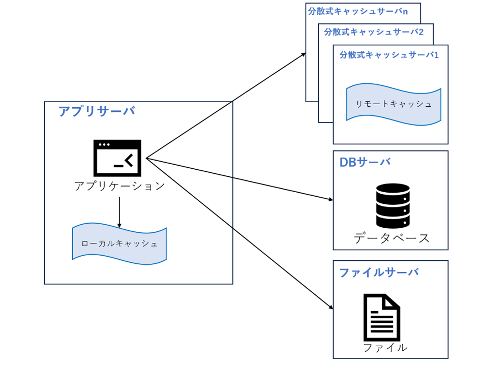 Web サイトで使用されるキャッシュは2種類あります。アプリケーションサーバーにキャッシュされるローカルキャッシュと、専用の分散キャッシュサーバーにキャッシュされるリモートキャッシュです。ローカルキャッシュのアクセス速度は高速ですが、アプリケーションサーバーのメモリ制限により、キャッシュされるデータの量は制限されます。リモート分散キャッシュでは、図 1.3 に示すように、クラスタを使用して大容量メモリサーバーを専用キャッシュサーバーを構築され、理論的にはメモリ容量に制限されないキャッシュサービスを提供できます。