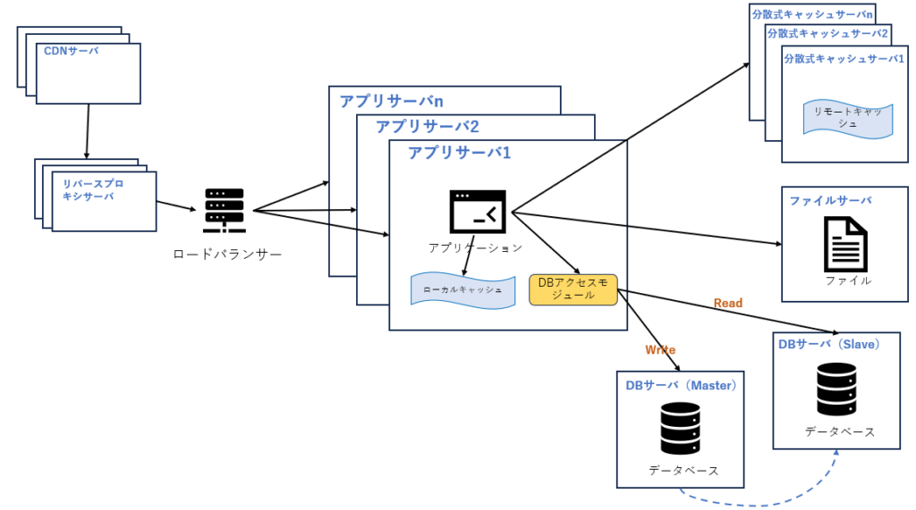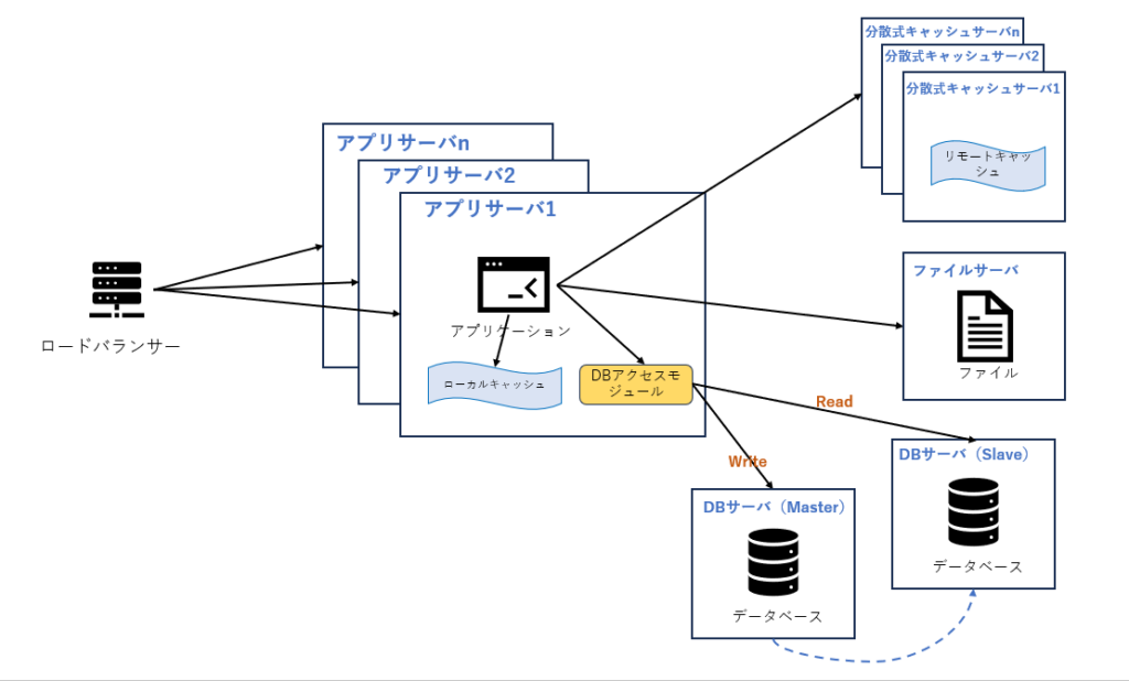 キャッシュを使用すると、ほとんどのデータ読み取りはDBを経由せずに完了できますが、一部の読み取り (キャッシュミス、キャッシュの有効期限切れ) と、すべての書き込みがDBへのアクセスが必要となります。DBの多くは、2 つのDB間でマスター/スレーブ関係を構成することにより、あるDBサーバーからのデータ更新を別のサーバーに同期させることができます。 Web サイトは、DBのこの機能を使用してDBの読み取り(Read)と書き込み(Write)の分離を実現し、アプリケーションサーバーがデータを書き込むときにマスターDBにアクセスし、データの更新をスレーブDBに同期します。これにより、アプリケーションがサーバーがデータを読み取るときに、DBからデータを取得できます。